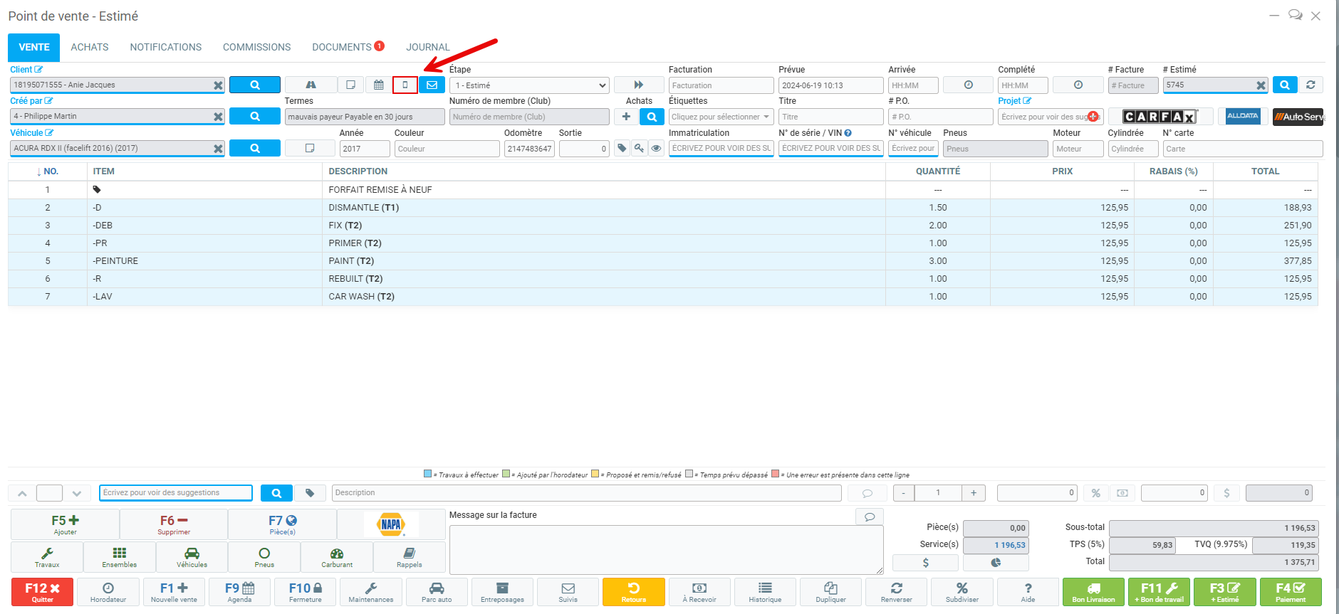 Dans le Point de vente de GEM-CAR, une fois qu'un client a été sélectionné, il est possible de lui envoyer un SMS. Cliquez sur la petite icône de téléphone en haut de l'écran.