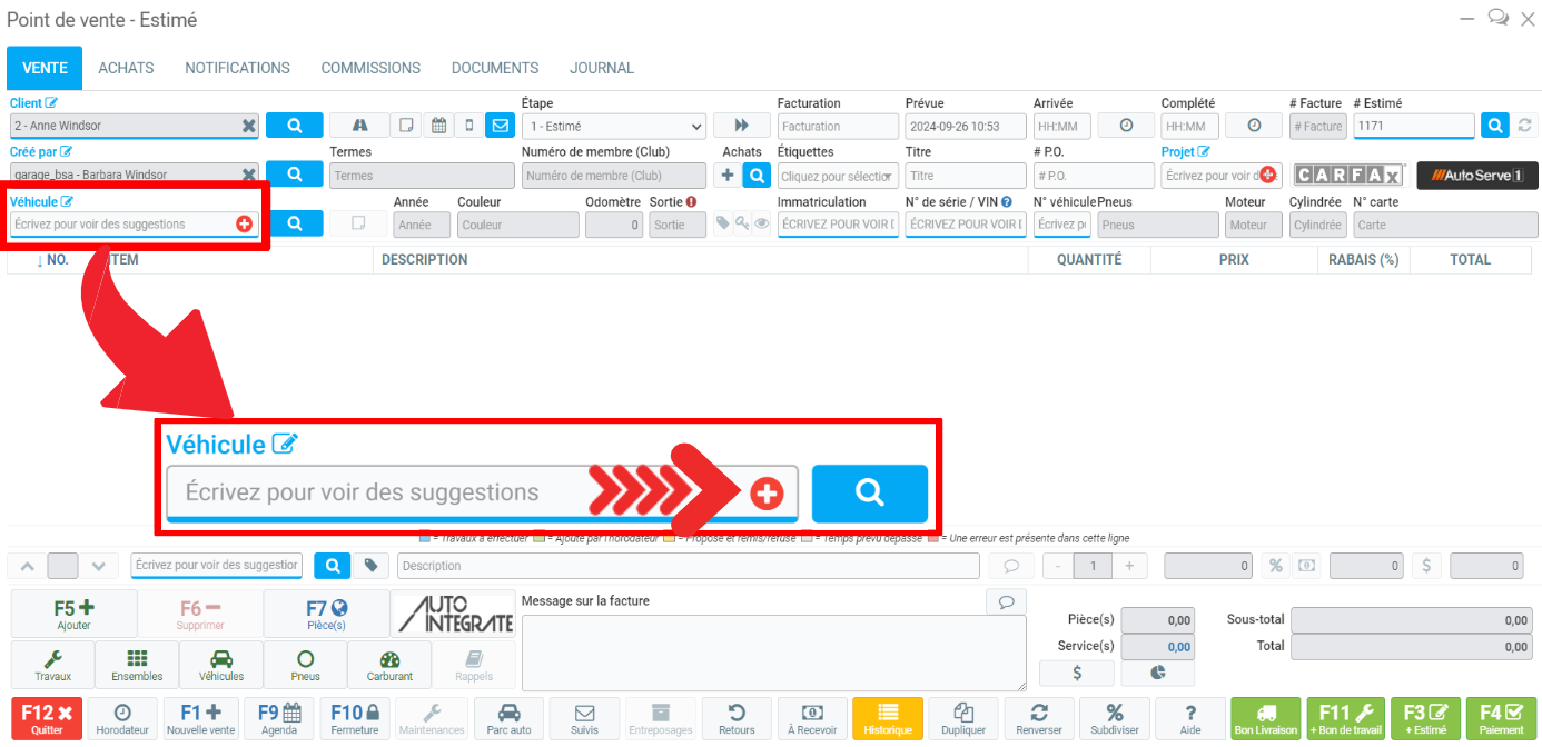 Ou vous pouvez créer un nouveau véhicule au Point de vente: sélectionnez un client dans le point de vente, vous pouvez ensuite cliquer sur le + rouge dans le menu Véhicule.