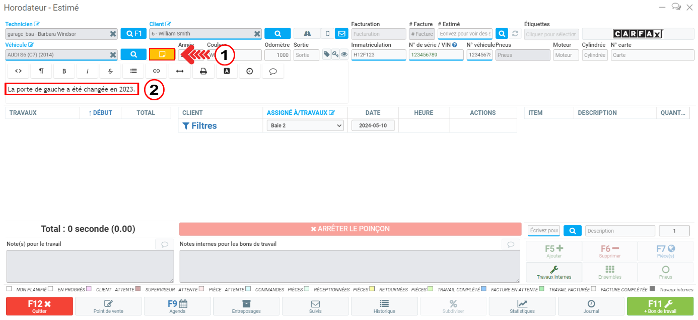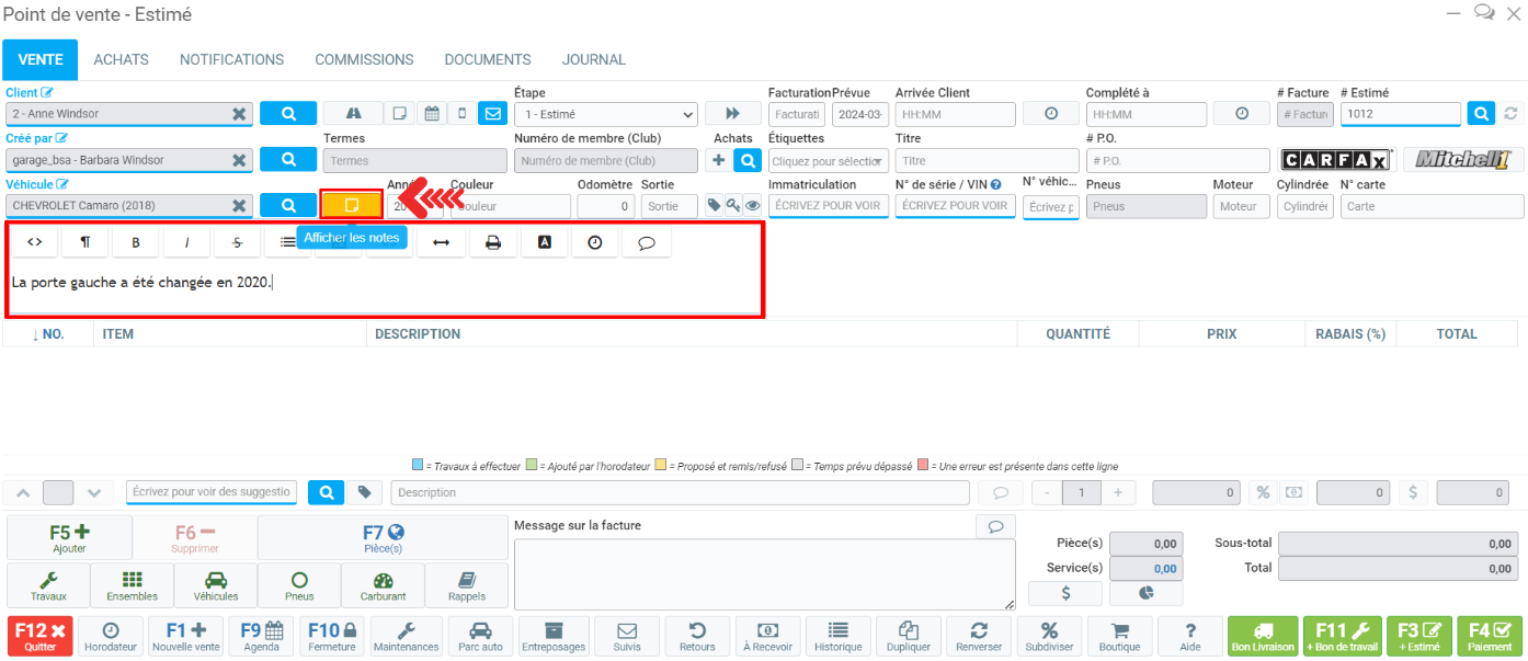 Mettre des notes sur un véhicule et les voir via le Point de vente