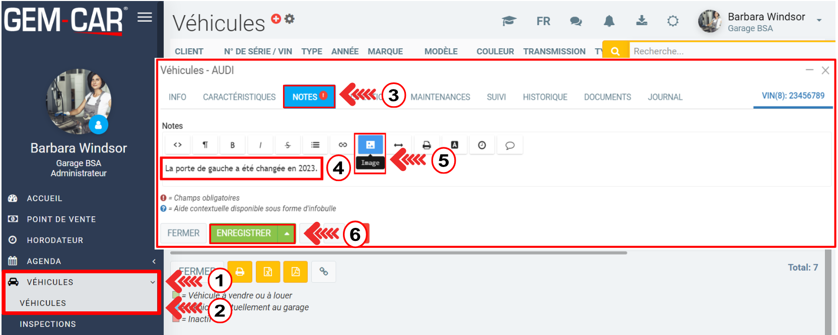 Pour conserver une note dans le dossier du client, cliquez sur le menu principal de gauche > Véhicules > Véhicules > Notes.