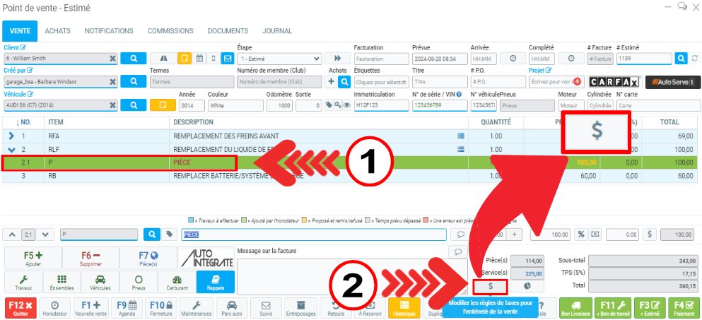 Ensuite, sélectionnez le produit pour lequel vous souhaitez modifier la taxe et cliquez sur le symbole $ dans le coin droit du Point de vente, sous les prix des Pièces et des Services.