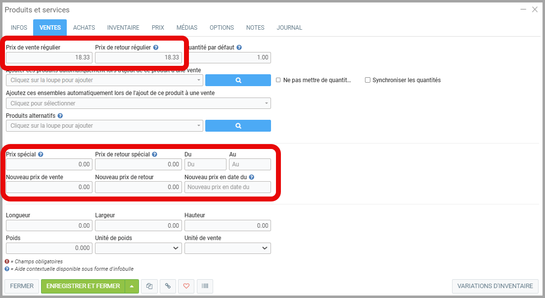 Cliquez sur l'onglet Vente. Vous pouvez alors modifier le prix de vente régulier et le prix de retour.