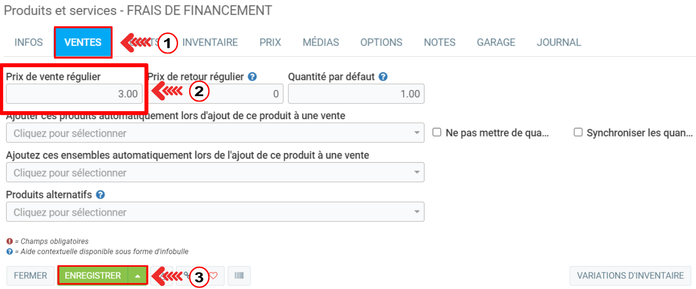 3) Après l'avoir sauvegardé, dans la même fenêtre, cliquez sur l'onglet Ventes pour définir le montant des frais financiers.