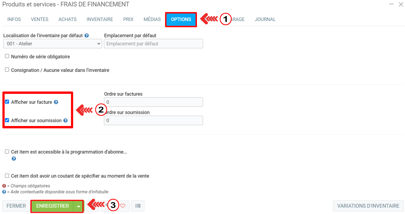- Cochez ou non les cases ''Afficher sur facture'' et ''Afficher sur soumission''.