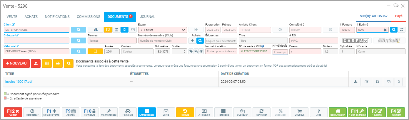 Ensuite, après avoir demandé et obtenu votre confirmation, GEM-CAR va créer pour vous, la facture numéro 100017, qui est le renversement de votre facture numéro 100015 d'origine. Elle sera déposée dans l'onglet Documents de la fiche.
