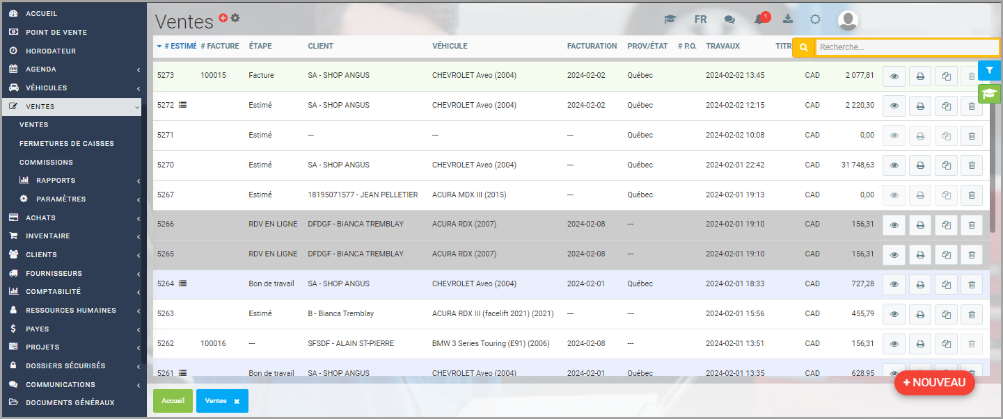 Dans le Menu principal situé à gauche de l'application, cliquez sur Ventes > Ventes pour afficher la liste des Ventes.
