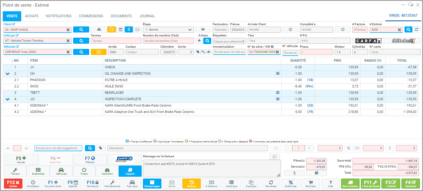 Lorsque vous cliquez sur le bouton, GEM-CAR vous demandera de confirmer le renversement. Cliquez sur OUI. GEM-CAR va immédiatement dupliquer la vente d'origine, mais avec des quantités négatives. Dans le cas présent, la vente numéro 1000015 sera dupliquée, créant ainsi la vente numéro 1000279, qui vous sera présentée à l'écran.