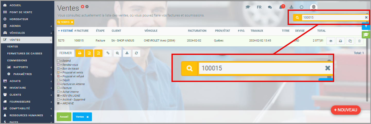 Si vous ne voyez pas le numéro de votre facture à inverser à l'écran et que vous souhaitez ne pas avoir à dérouler des pages et des pages pour retrouver la vente à partir de laquelle cette facture à renverser a été créée, la méthode alternative est d'effectuer une recherche à partir du numéro de la facture à renverser.