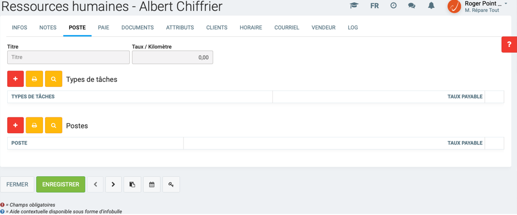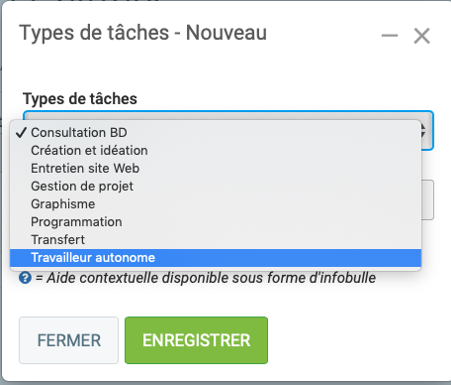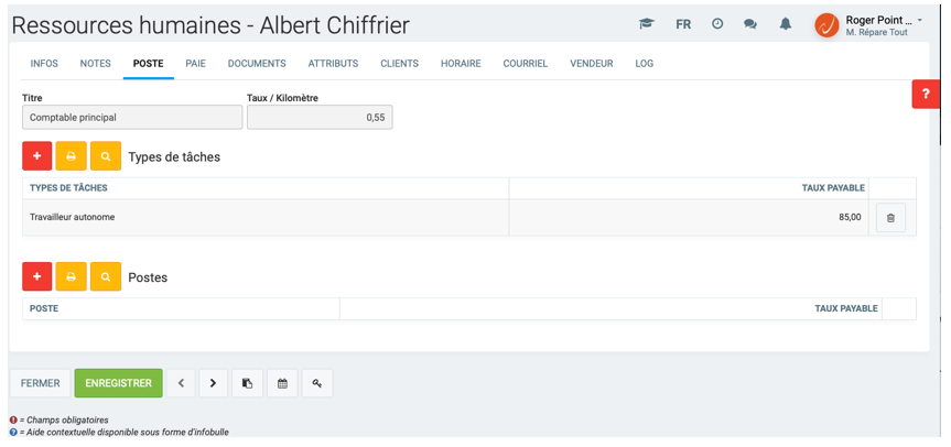 Dans la section "Types de tâches", vous pourrez définir chacune des diverses tâches que cette ressource humaine est appelée à effectuer à l'intérieur de son mandat au sein de l'entreprise et y indiquer le taux payable convenu pour chacune d'elles.