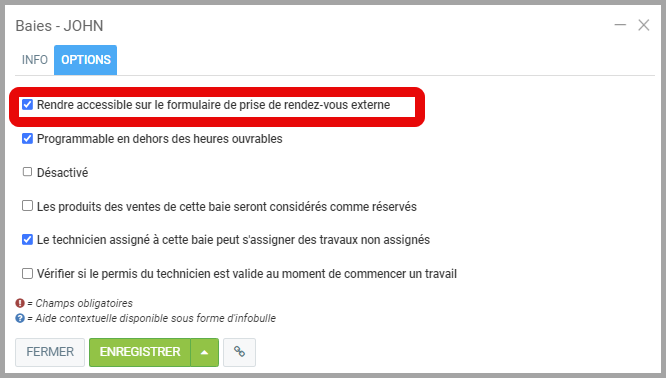 - Sous l'onglet Options, sélectionnez Rendre accessible sur le formulaire de prise de rendez-vous externe.