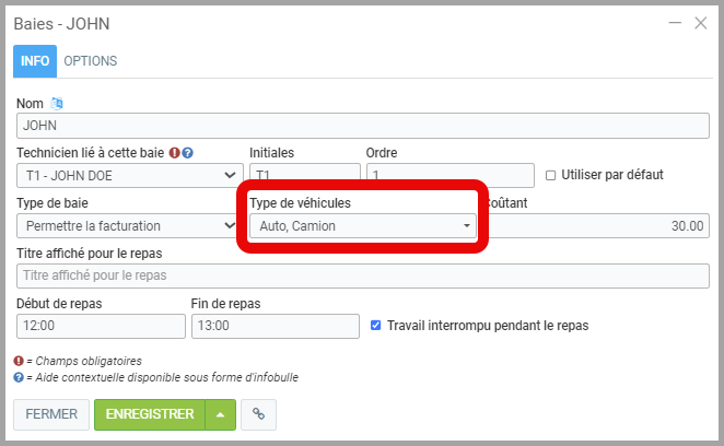 - Sous l'onglet Info de la baie, choisissez le Type de véhicule pour lequel vous offrez les services. Ils seront affichés dans le menu de réservation de rendez-vous sur votre site Web.
