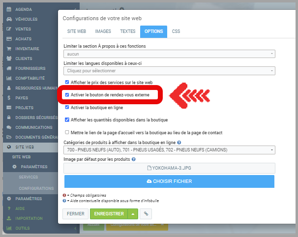 - Dans le Menu principal situé à gauche de l'application, cliquez sur Site Web > Paramètres > Configurations > onglet Options. Assurez-vous que Activer le bouton de rendez-vous externe est sélectionné.