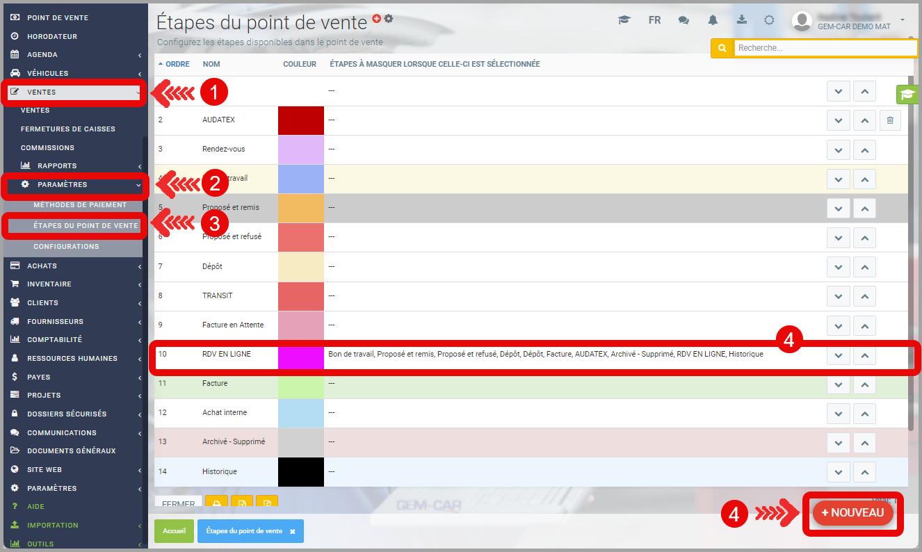 - À partir du menu principal situé à gauche de l'application, cliquez sur Ventes > Paramètres > Étapes du Point de Vente.