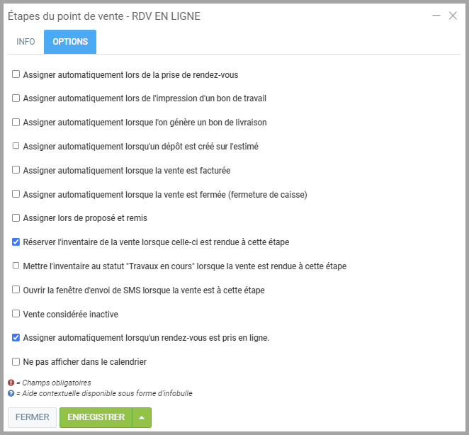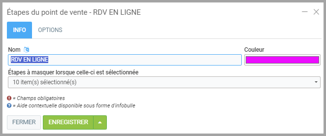 Dans les options des étapes du point de vente, vous pouvez configurer une étape et une couleur afin de savoir si c'est un rendez-vous externe.