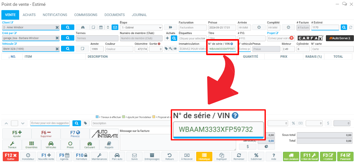 Lorsque vous ouvrez le Point de vente, après avoir sélectionné le client et son véhicule, vous pouvez remarquer que le Numéro de série/VIN a des couleurs différentes: vert ou rouge.