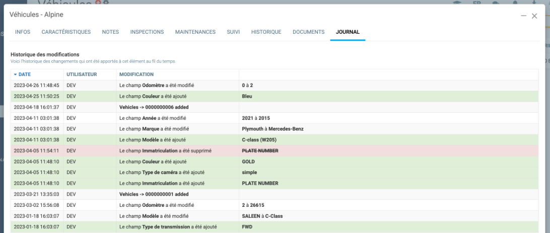 Consultation de l'historique des modifications apportées à la fiche du véhicule