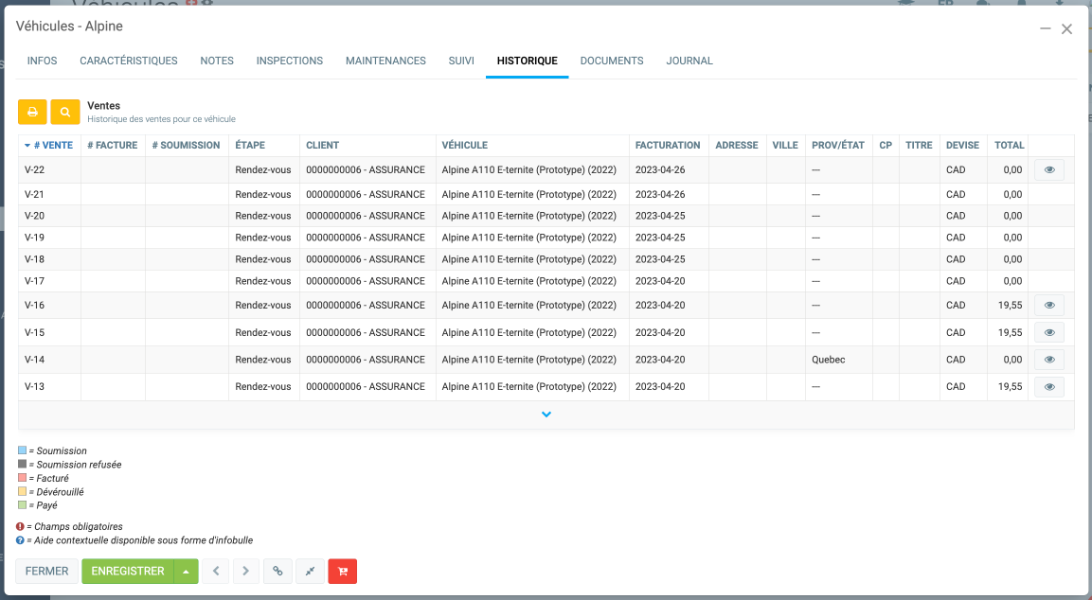 Consultation de l'historique des ventes/ job en regard avec un véhicule
