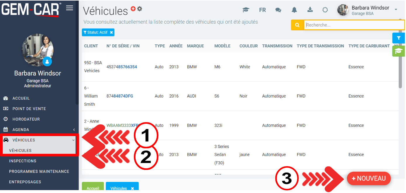 Pour consulter la liste des véhicules, dans le menu principal situé à gauche de l'application, cliquez sur Véhicules > Véhicules > +Nouveau.