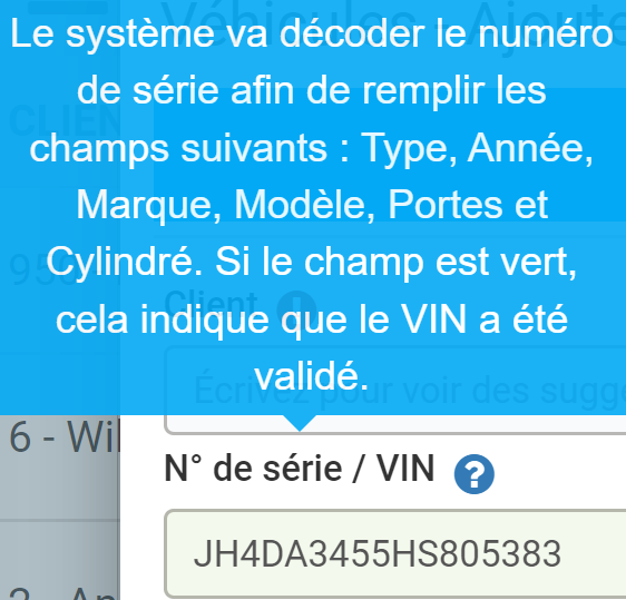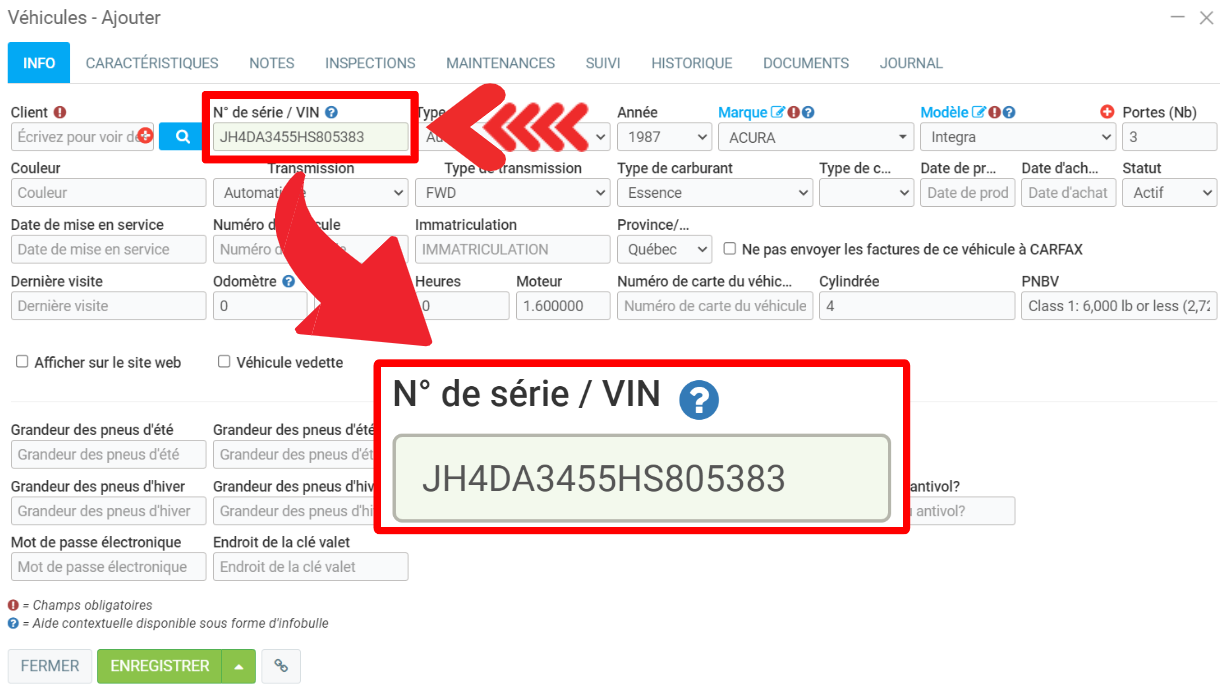 Dans la fiche d'un véhicule, si vous entrez le numéro de série d'un véhicule et que celui-ci est valide, vous verrez plusieurs champs se remplir automatiquement à l'aide de l'information retournée par le VIN Decoder.