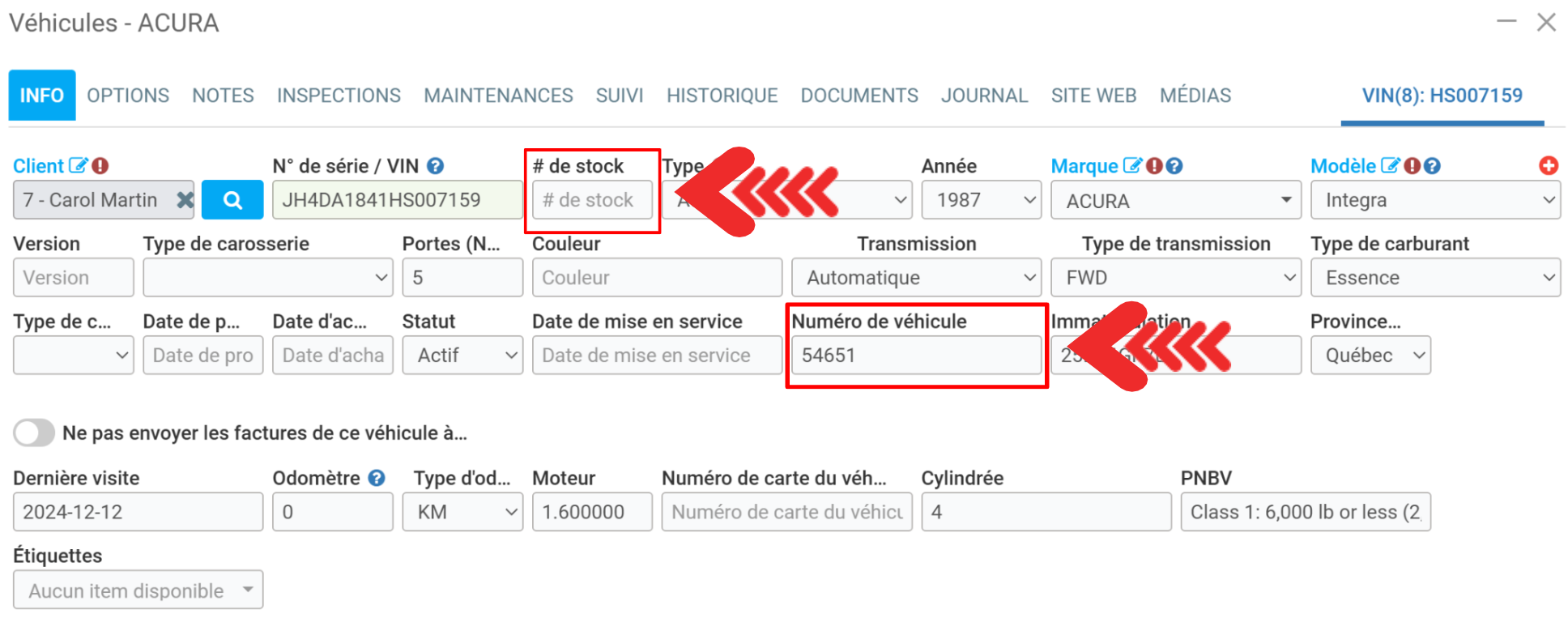 Dans l'onglet Info, vous pouvez vérifier le # de stock, entre Nº de série/VIN et Type.