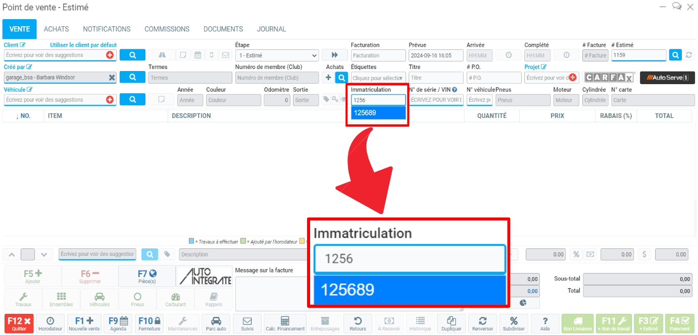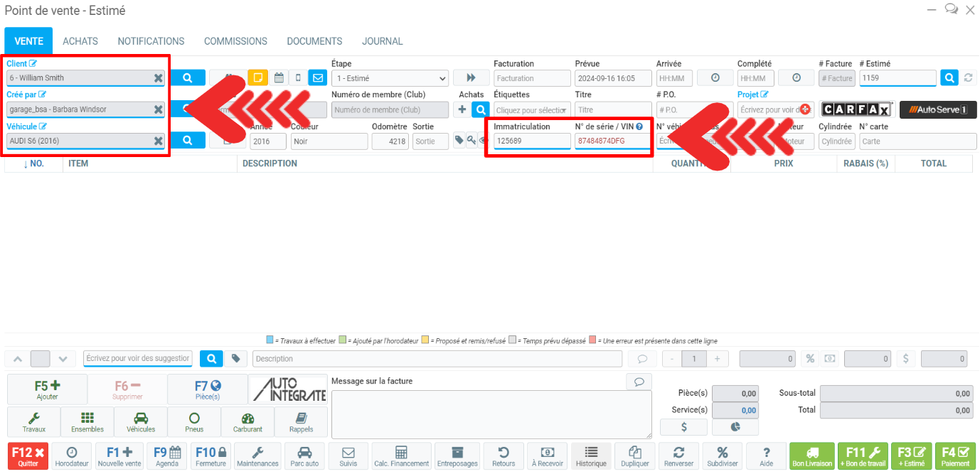 Les autres informations relatives au véhicule apparaissent dans le Point de vente et vous pouvez poursuivre la création de la vente comme d'habitude.