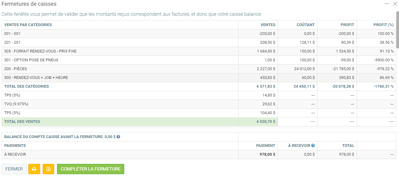 À partir de ces informations, vous allez donc pouvoir valider si votre caisse balance. La première section et la deuxième section ont chacun un total qui devrait être le même dans les deux cas. Si ce n'est pas le cas, la fermeture ne pourra pas être complété, il vous faudra trouver l'erreur avant de la compléter.