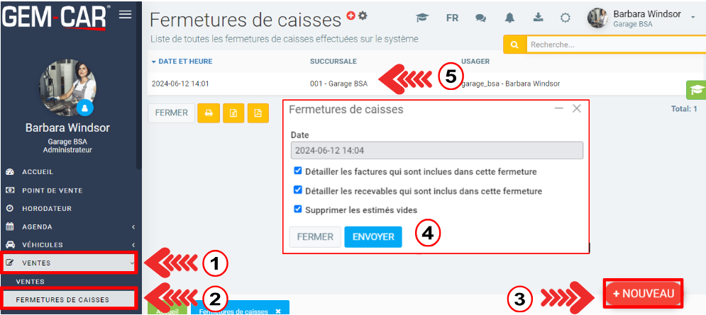 Choisissez la date et cliquez sur Envoyer. La fermeture de caisse apparaît dans la liste.
