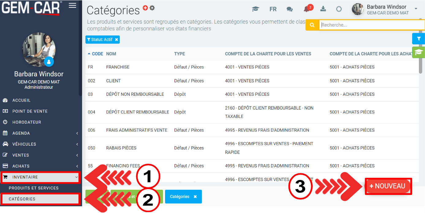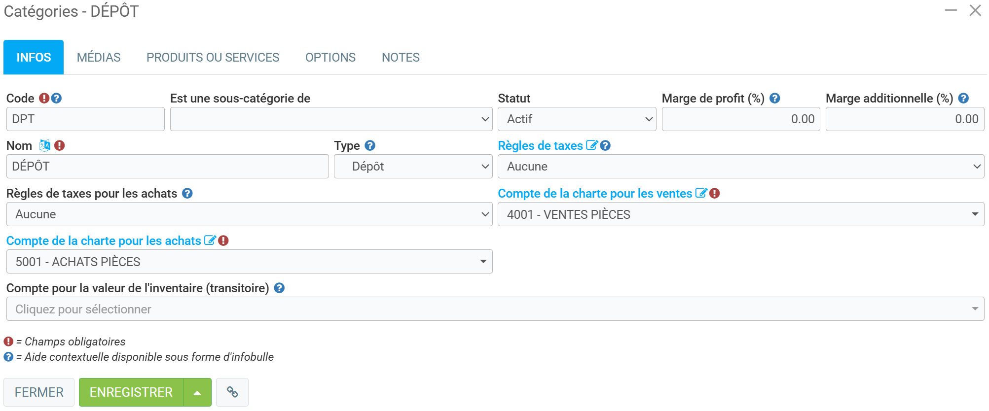Pour créer une catégorie type dépôt, cliquez sur Inventaire > Catégories > +Nouveau.