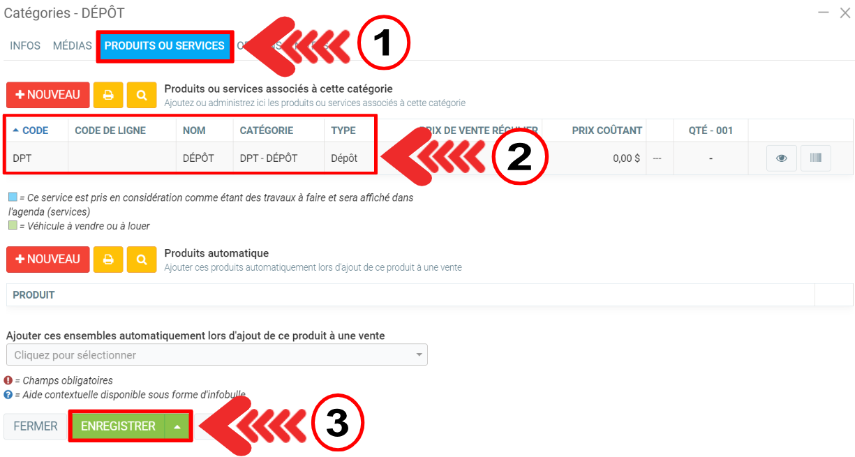 Une fois que vous avez créé le produit dépôt et que vous l'avez associé à cette catégorie, il apparaît dans l'onglet Produits ou services.