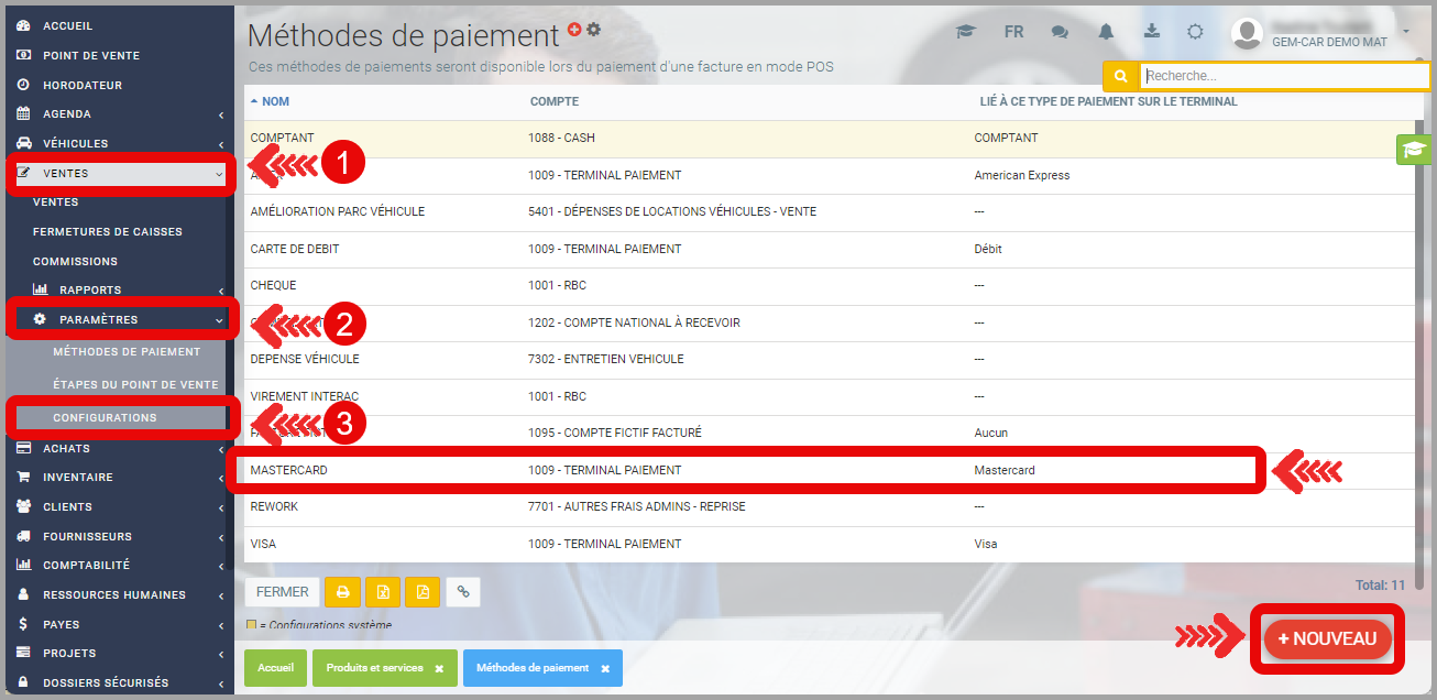 Pour modifier vos méthodes de paiement, à partir du menu principal situé à gauche de l'application, cliquez sur Ventes > Paramètres > Méthodes de paiement.