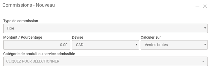 Peu importe la méthode (clients ou ressources humaines), le processus de configuration est le même. Pour ajouter une commission, rendez-vous dans la liste spécifiée dans la méthode que vous avez choisie, et cliquer sur le +. La fenêtre suivante apparaît.