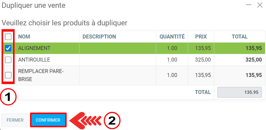Lorsque vous cliquez sur l'icône, une fenêtre s'ouvre et vous indique les éléments à sélectionner pour dupliquer la vente.