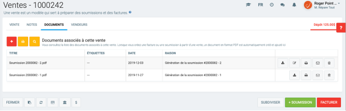 Cette nouvelle version de votre soumission sera elle aussi déposée dans l'onglet DOCUMENTS de votre fiche vente. Puisque la version originale de votre soumission portait le numéro 2000082 - 1, le numéro de la Soumission "éditée" ainsi créée sera incrémenté de 1 et s'affichera portant le numéro 2000082 - 2.