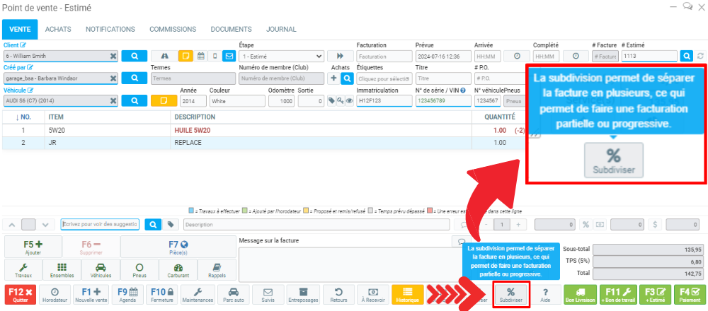 Dans GEM-CAR, nous parlerons de Subdiviser une vente.