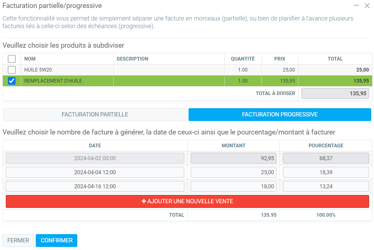 Vous pouvez également utiliser le bouton Facturation progressive pour choisir le nombre de facture à générer.