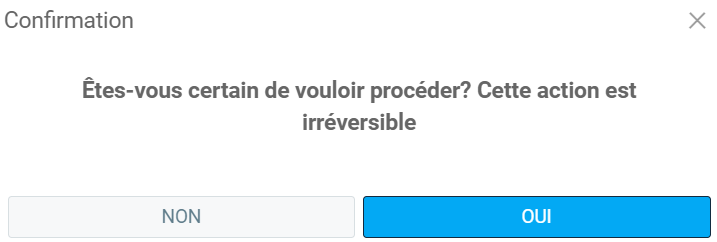 Une fenêtre de confirmation apparaît avec le message suivant: ''Êtes-vous certain de vouloir procéder? Cette action est irréversible''