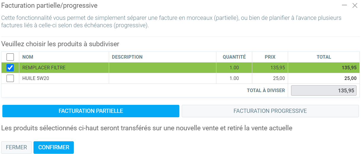 Il peut parfois arriver qu'on doive créer une facture pour seulement une partie d'une vente et non la totalité de celle-ci.